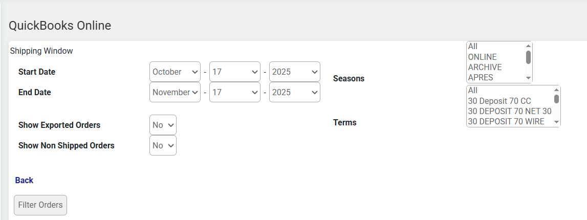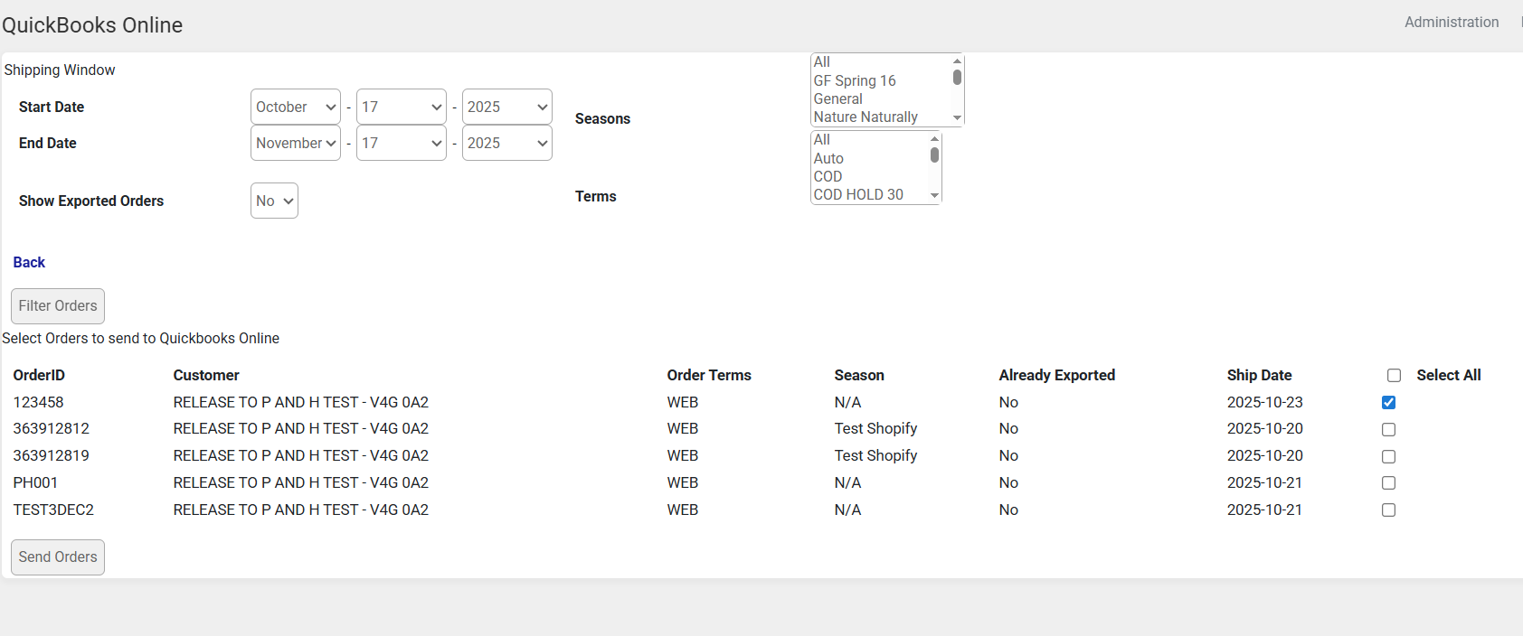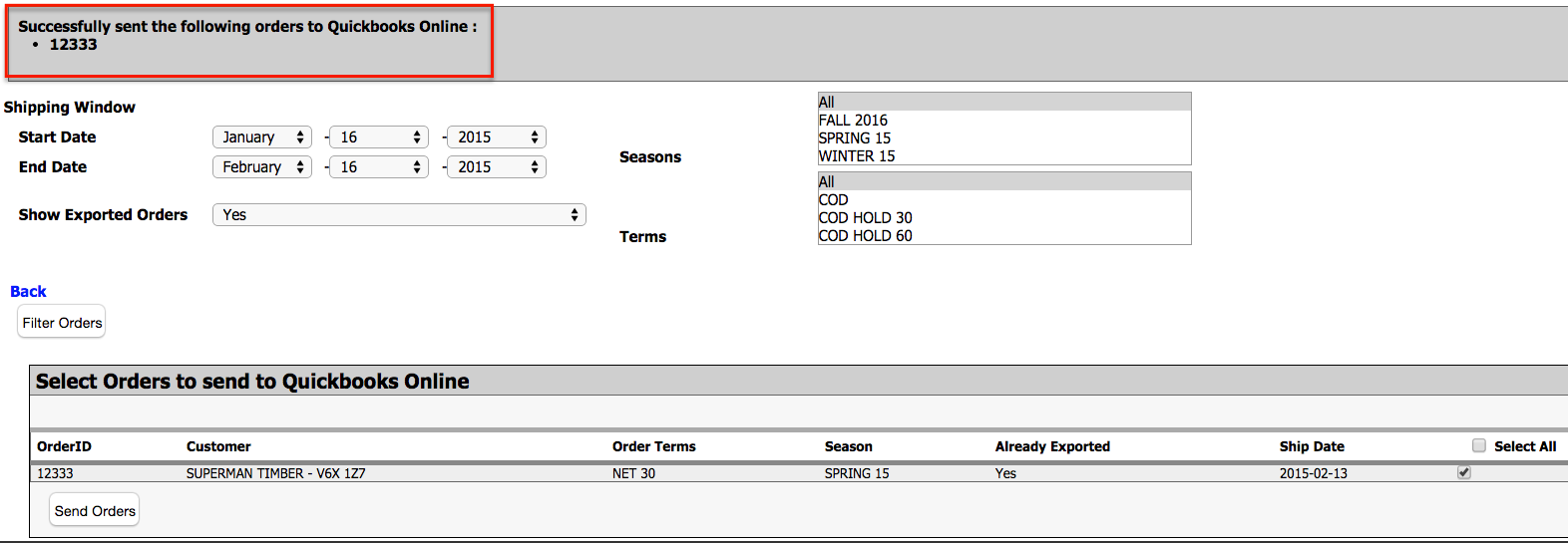 - A list off all your invoices will display below by Order ID / Customer / Order Terms / Season / Already Exported / Ship Date. Select the order by clicking the check box beside each order > click Send Orders.