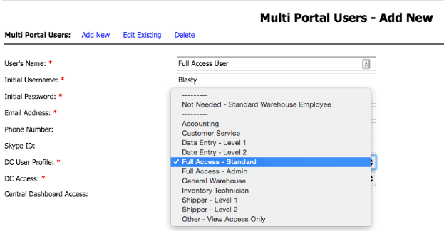 - DC User Profile:* Many options for you to choose from for the needs of the warehouse employee. If they are full access and can require all tabs you select
