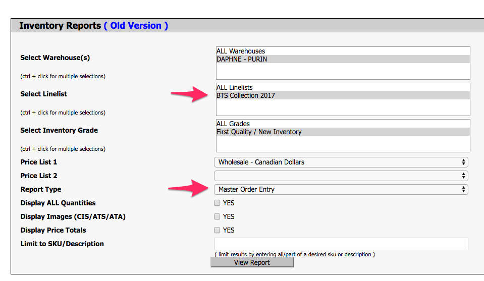 Navigation: Inventory tab > (New or Old View) in the header > Select your Linelist > Select your Pricelist > Report Type select Master Order Entry (MOE) from the drop-down.