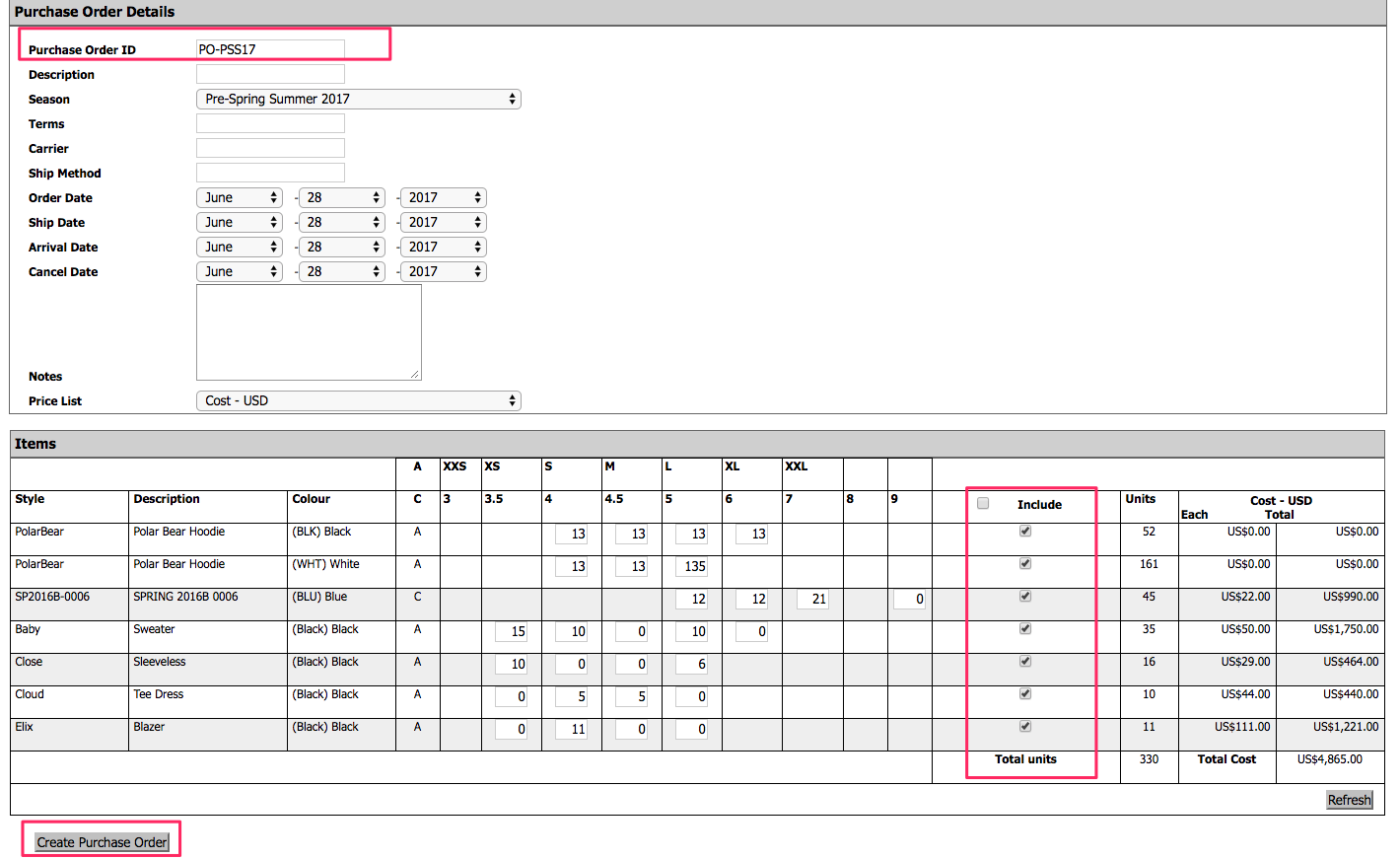 Please note a Purchase Order can only contain one Season's products. If you need to order SKUs from different Season/Linelist, please create a separate PO.