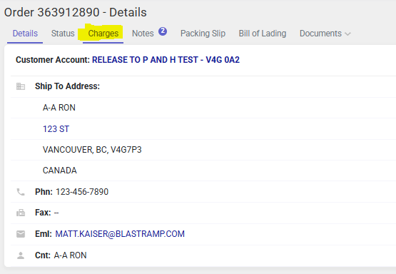 Note: If charges cannot be edited and you see the message “The charges for this order appear on Invoice ####” at the bottom of the Charges screen, the order has already been invoiced. Once invoiced, charges are locked and cannot be modified.